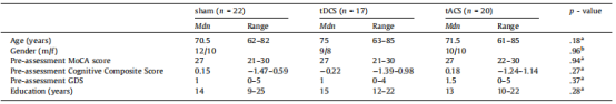 刺激组在年龄、性别、受教育程度、一般认知表现(MoCA)、GDS评分和认知综合评分方面没有显著差异(表2)。